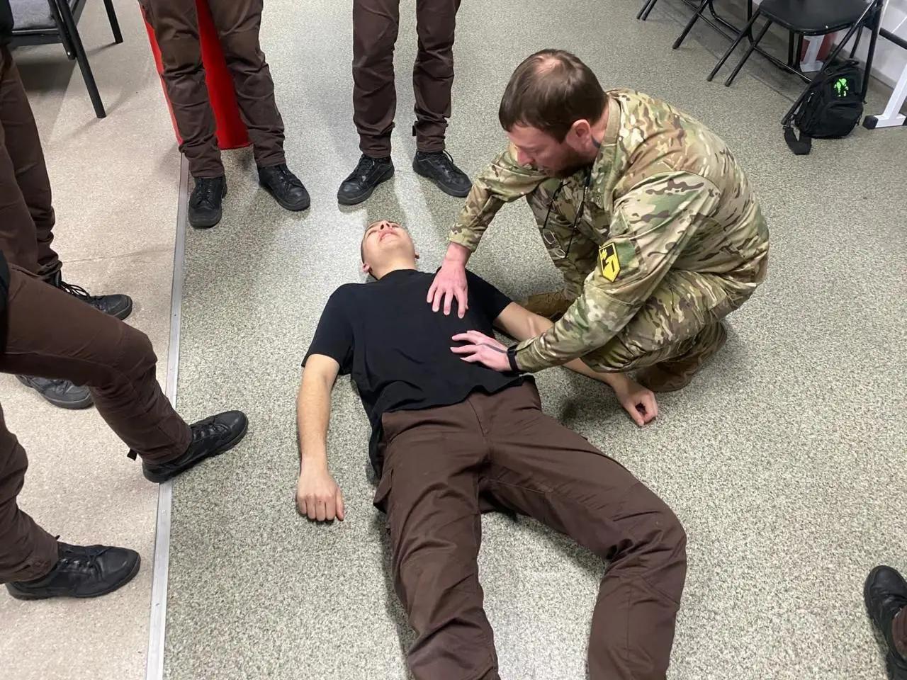Під час заняття учасники опановували алгоритм дій у разі порушення дихання та способи забезпечення прохідності дихальних шляхів. Інструктор продемонстрував техніку перевертання постраждалого у стабільне бокове положення, а також прийом висування нижньої щелепи для відновлення прохідності дихання.